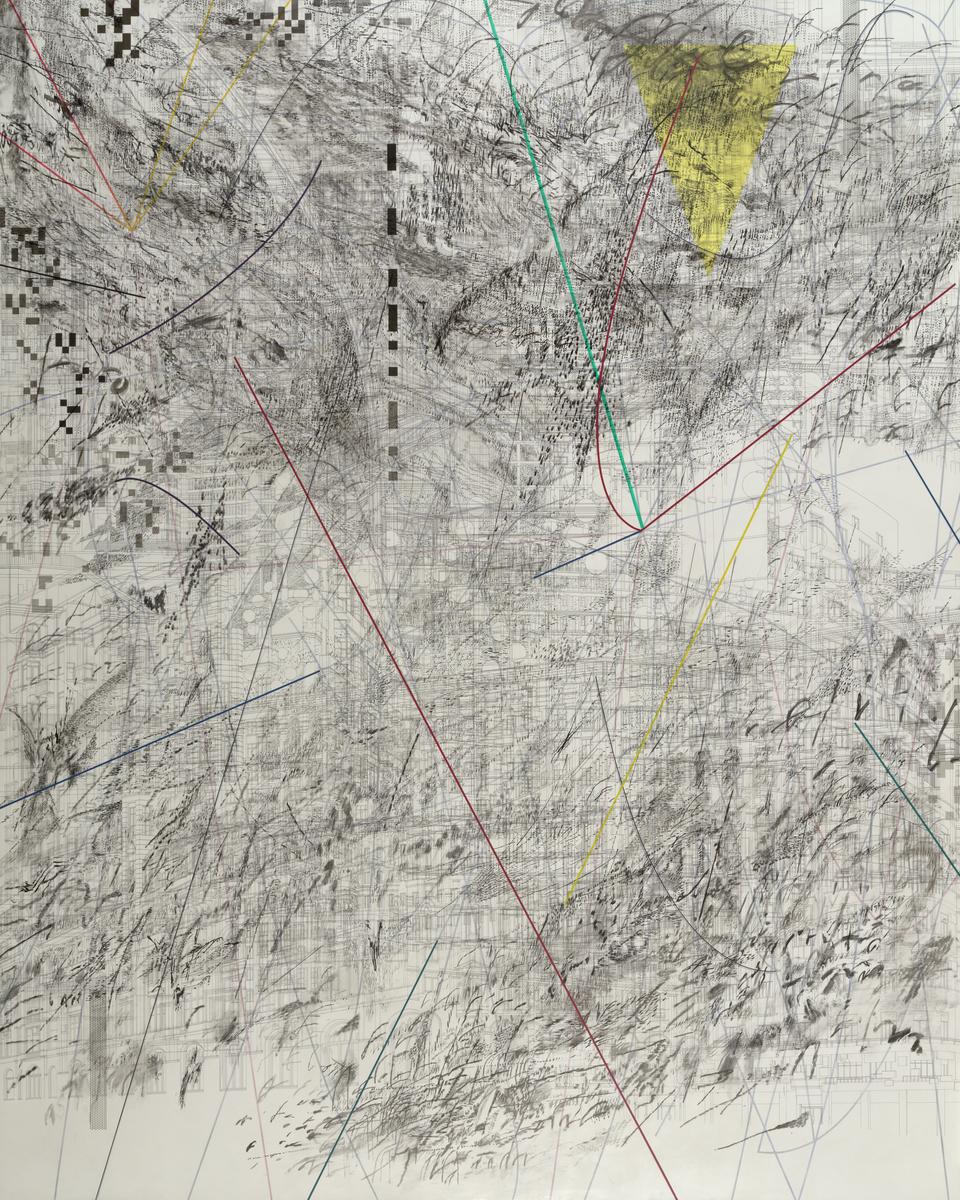 전시는 도시계획도, 건축 도면, 지도 등 기능적이고 냉정한 시각 정보 구조 위에 작가의 감정과 기억이 중첩되는 회화 구조를 중심에 둔다. 특히 ‘Black City’(2007), ‘Mogamma’(2012), ‘Stadia’(2004~2010) 등의 대형 캔버스는, 추상적 언어로 재구성된 도시의 정치적 해부학이자, 감정의 운동성으로서의 회화를 선명하게 드러낸다. 작가의 회화는 공간과 시간을 해체하고, 기억과 분노, 이동과 경계를 시각화하는 정치적 지도이자 감정의 지형도이다.