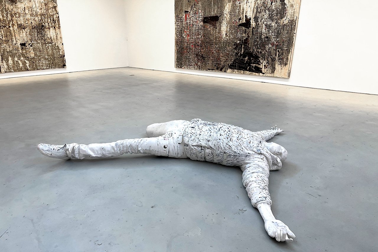형식적으로는 종이, 섬유, 레진 등 다양한 재료를 층층이 겹쳐 만든 조각 표면에서, 브래드포드 특유의 재료 실험과 해체적 미감이 읽힌다. 표면의 주름과 갈라진 틈은 신체의 상처를 시각화하며, 정적인 포즈에도 불구하고 극적인 긴장감을 자아낸다. 이는 그가 12세에 감독한 슈퍼 8 필름 속 장면에서 반복적으로 등장하는 ‘총에 맞고 쓰러지는 소년’의 슬로우 모션 루프와도 연결되며, 자전적 기억과 신화적 반복 사이의 경계가 흐려진다.